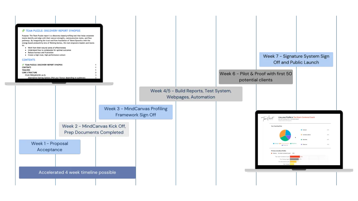 > Partnership or Signature pathway: 3–4 weeks for a full, branded system with reports, landing pages, and automations.